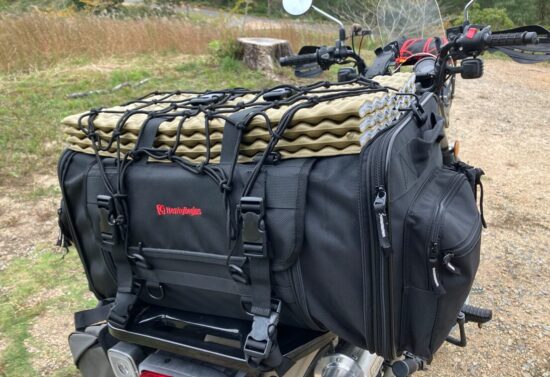 KEMIMOTOのシートバッグは、45〜55Lまで容量を調整でき、1泊2日のキャンプや短距離ツーリングに最適です。