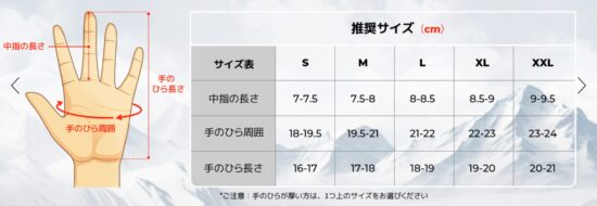 電源を入れるとすぐに指先から温まり、グリップヒーター併用で指先だけ温めたい用途に合っています。普段どおりMサイズを選び、やや大きめに感じるものの実用上は問題なく、サイズ感には納得。コストパフォーマンスと品質のバランスが良いブランドです。