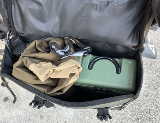 サイドバックがあれば、リアボックに収まらないキャンプギアを収納が出来ますし、雨具や車種工具入れとして幅広い使い方が可能です。